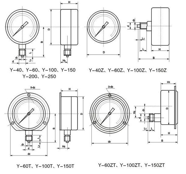 儀表的測量系統(tǒng)由接頭、彈簧和傳動機(jī)構(gòu)組成。通過指針指示儀表讀數(shù)。